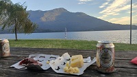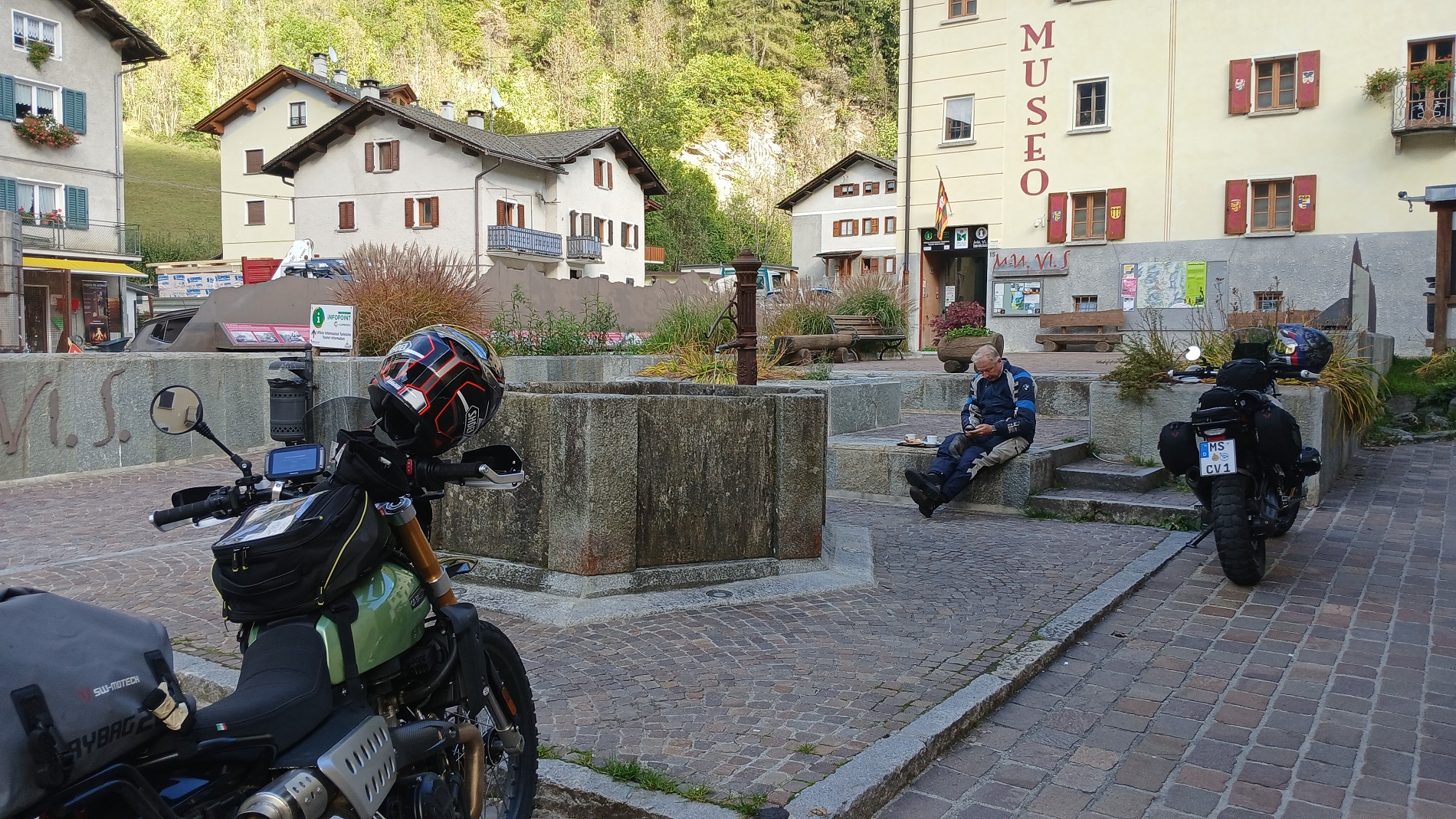 Cappuccino Pause in Campodolcino, Tagesziel dort ausgesucht + später erreicht: Am Comer See bei Speck aus Österreich, StranigerAlm Käse und Forst Pils aus Südtirol..