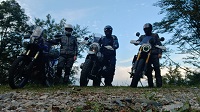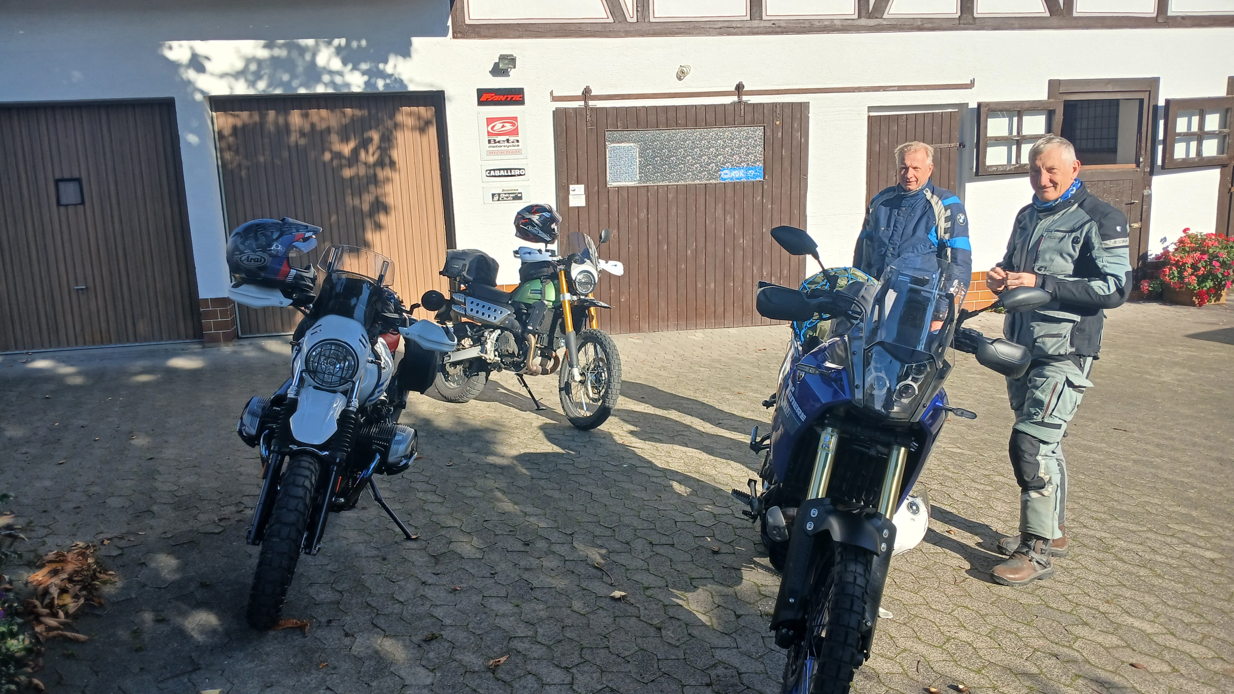 Das Team: Heiko (Fantic Caballero 500 Rally) und aus Münster angereist: Christian (BMW R9T 1200 mit Wilbers +70mm Fahrwerk) und Edgar (Yamaha Ténéré 700)
