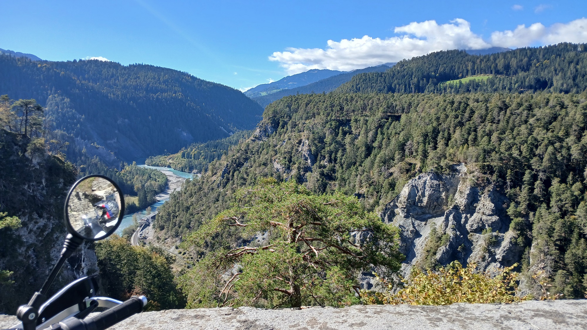 Blick in die Rheinschlucht und Danke an die beiden knallroten Kustflieger, die während unseres schauens in schöner Formation da durch sind..